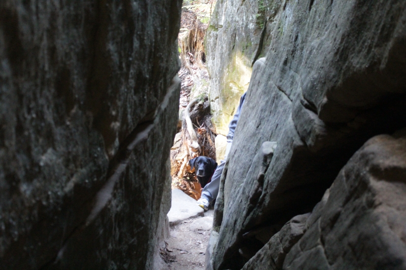 Sliding down a tilted boulder and walking through some tight spaces were required