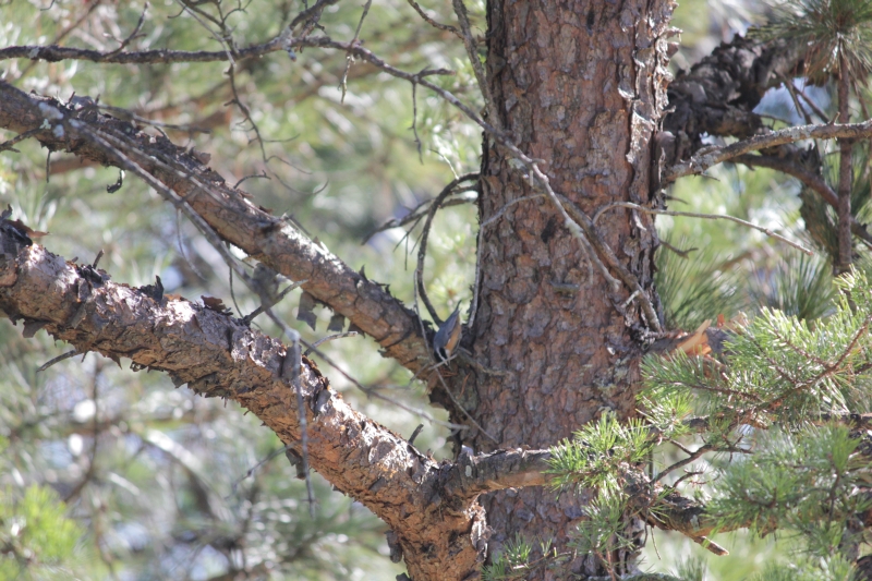 A Red-Breasted Nuthatch searches a tree for hidden goodies