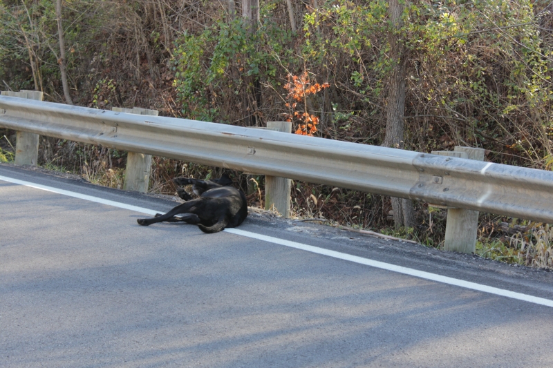 One last adventure occurred.  On the way back, we stopped by an old house where my mother spent some time while growing up.  My brother’s dog found a dead opossum alongside the road and rolled on it!  I was quick with the camera and got a shot of the action: