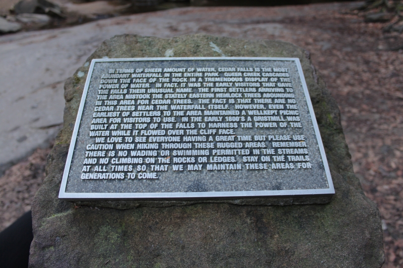 The name Cedar Falls is a misnomer โ€” the result of mistaken identity. Early settlers to the area misidentified the stately hemlock trees as cedar trees; consequently, this park was incorrectly named. Despite the mistake, the name Cedar Falls has been used ever since.