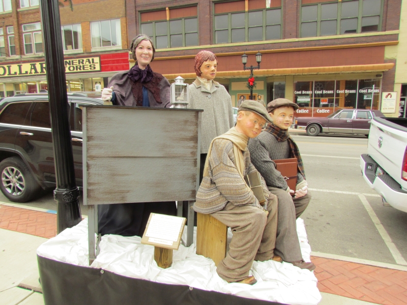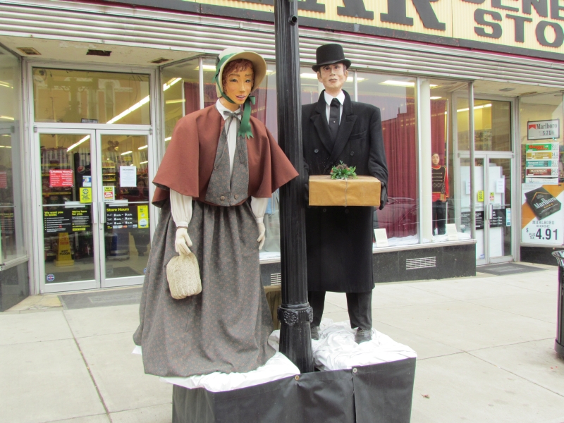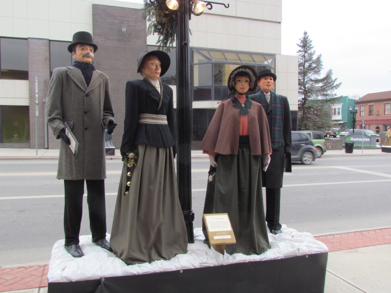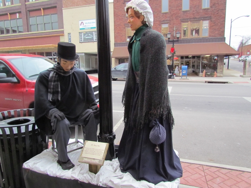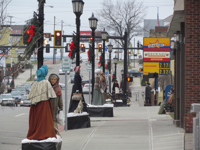 The Dickens scenes are stationed along Wheeling Avenue at each antique lamppost and bench, between 6th and 11th Streets, in windows on street level, and in second story windows. Wheeling Avenue is also the historic National Road/Route 40, and features an outstanding streetscape of original buildings from the 1800s. The Dickens Victorian Village scenes are comprised of life sized and hand-made mannequins wearing real vintage clothing. The faces for each character are individually sculpted and painted by local artists.