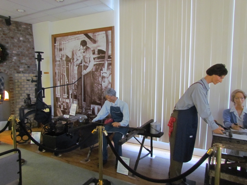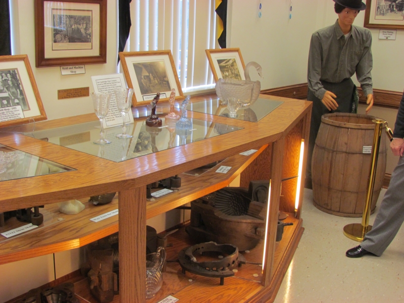 The History of Glassmaking is represented using mannequins in 1100 square feet of exhibits with a mock furnace, tools, molds, and other items involved in the manufacturing process of fine handmade glassware. Within this area, visitors can see an etching table, a decorating area, and an engraving/cutting area.