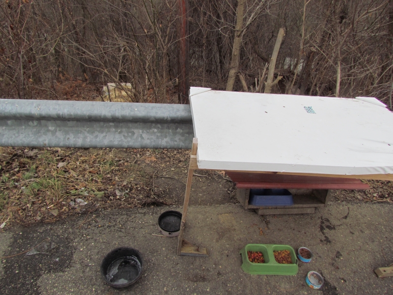 At the back of the parking lot was a little shelter where someone was feeding stray cats- down below the railing was a small haybale area where the cats could sleep. There are many animal lovers out there.