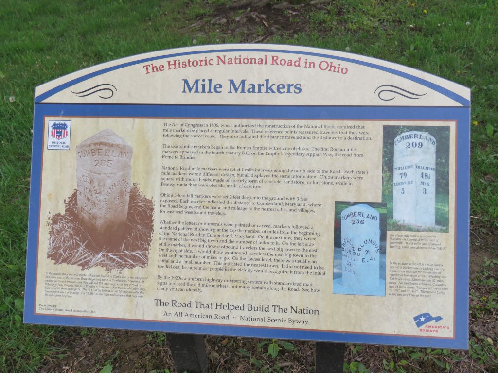 In Ohio, there were 5-foot-tall stone mile markers on the north side of the National Road every single mile. I’ve seen several of these markers still there along Route 40 (83 are still in place). The markers tell you the distance to Cumberland Maryland (the start of the road) and the distance to the nearest towns to the east and west of the marker (larger towns in the area are also noted). It’s easy to take such markers for granted now, but back in the 19th century there wasn’t a lot of information available for travelers!