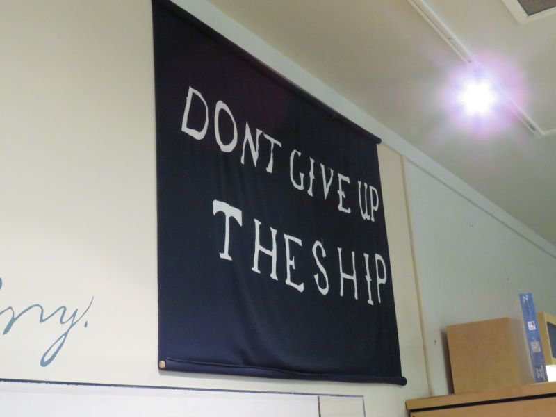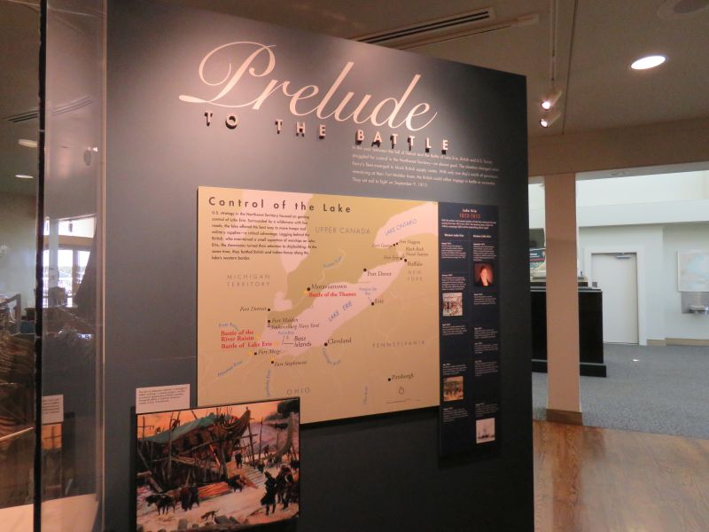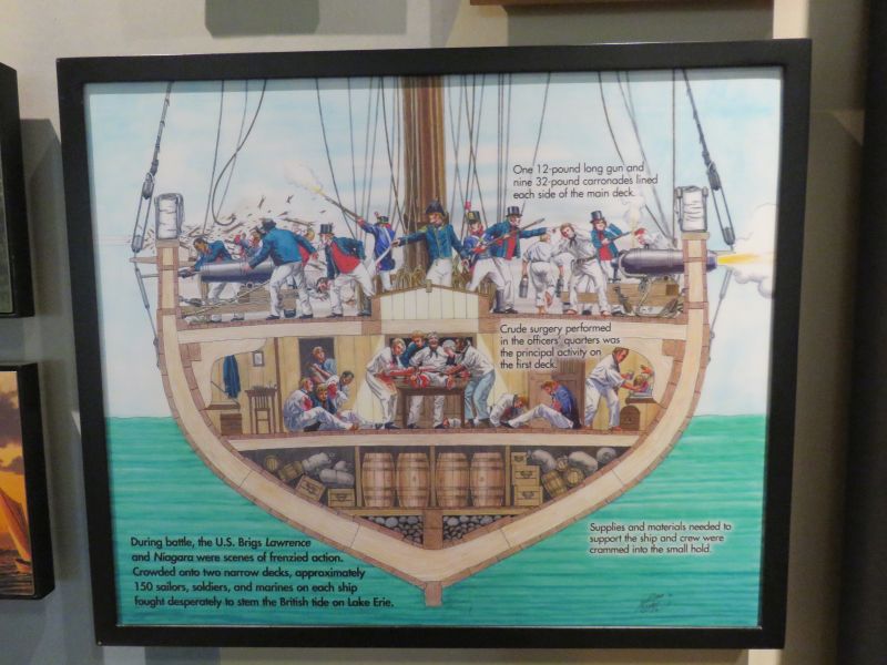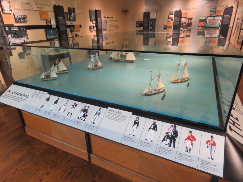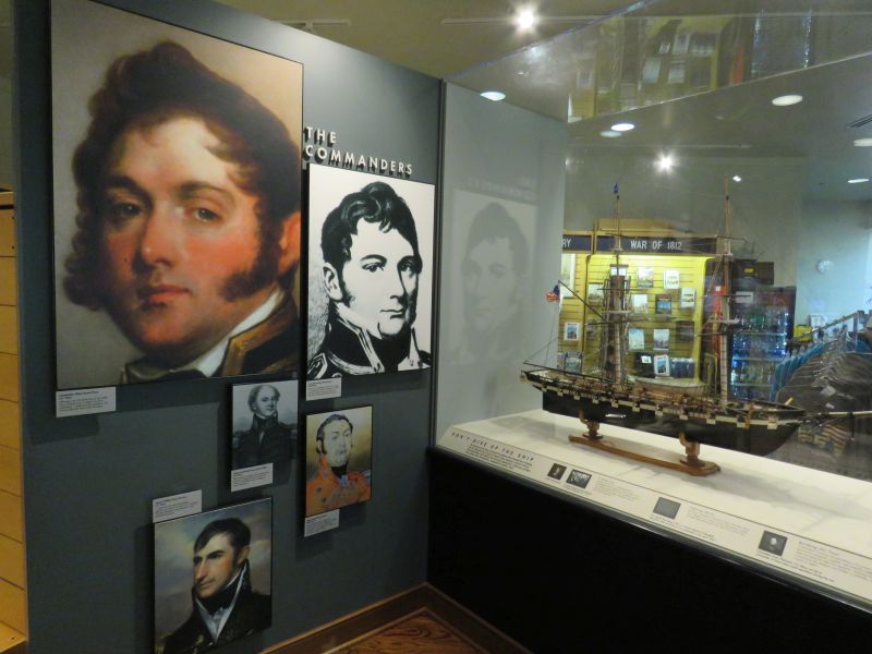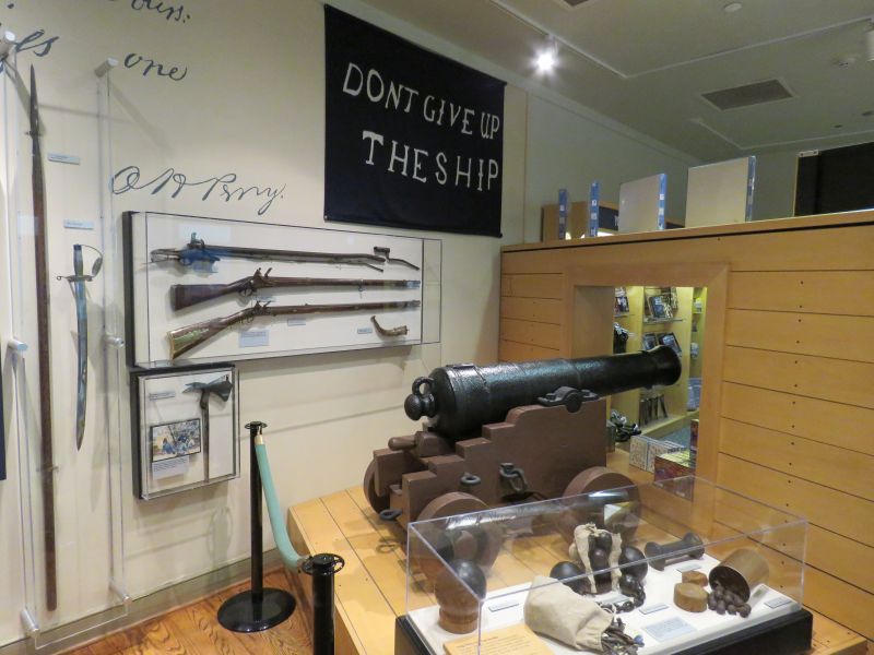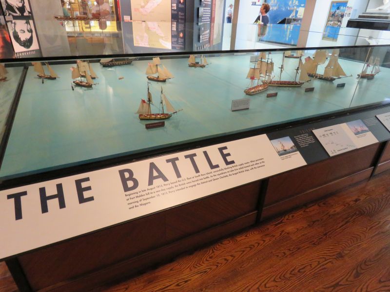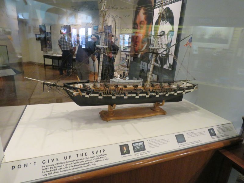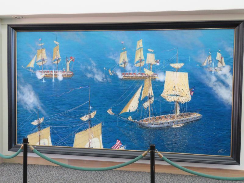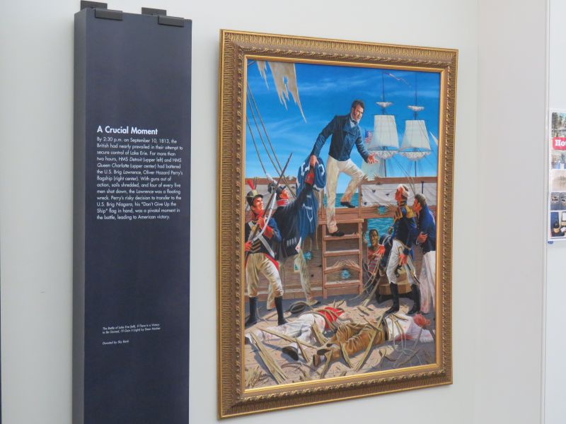 A model of Perry’s flagship the USS Lawrence was on display. It nearly sank and was abandoned by Perry, who continued the fight on the brig Niagara. He took the battle flag with him. This event was commemorated in many paintings.