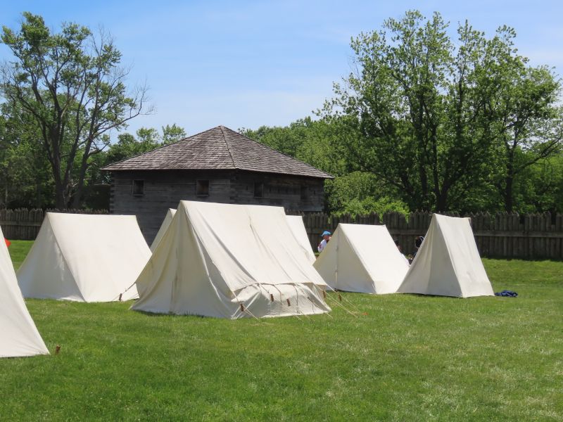 The fort was a substantial size- at the time it was the largest wooden-walled fortification in North America. Note the earthen slope that was built against the fort’s wooden walls- this substantially reinforced the fort against artillery bombardment. Blockhouses (as seen in the photo above) were used for defense, not living quarters. The troops lived in tents. Winter weather was harsh (a sentry froze to death on his 2-hour guard shift).