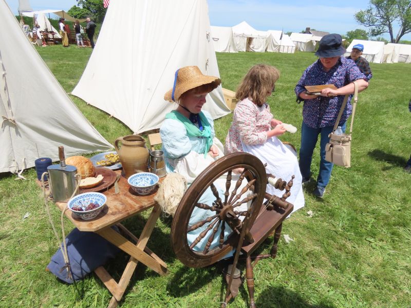 These ladies in the camp demonstrated how wool was carded and spun into yarn and cloth. Before the Industrial Revolution, such activity was done in many a home. The food looked good too!