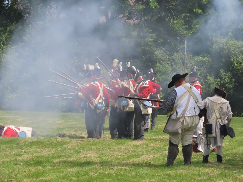 The British wear their traditional redcoats. The man kneeling in the foreground is a Pioneer, a combat engineer at the time. They would create or dismantle obstacles.