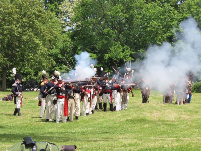 Firing the cannon was of course a loud event! A standard 6-pounder cannon of the time (firing a 6-pound shell) could fire a mile or two with varying accuracy. Napoleon came up with the brilliantly diabolical idea of firing cannonballs along the ground so that they would swiftly roll through infantry formations. It was a terrifying tactic.
