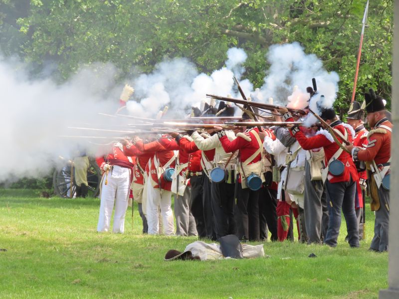 The British return fire. Great Britain was the military superpower of the day (along with Napoleon’s France). They used the largest-caliber ammunition of the war for their muskets, .75 caliber. Americans used .50-.60 caliber rounds, which meant the British could use captured American ammo but the Americans couldn’t use Brit rounds.